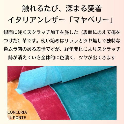当製品には、イタリアの老舗タンナー、IL PONTE社の「マヤベリー」を使用。独特の風合いと深みのある色合いが魅力的で、使い込むほどに自身だけのエイジングを実感できます。初めはマットであった風合いが、使用することで、オイルが革の内部から現れ、美しい光沢が生まれます。