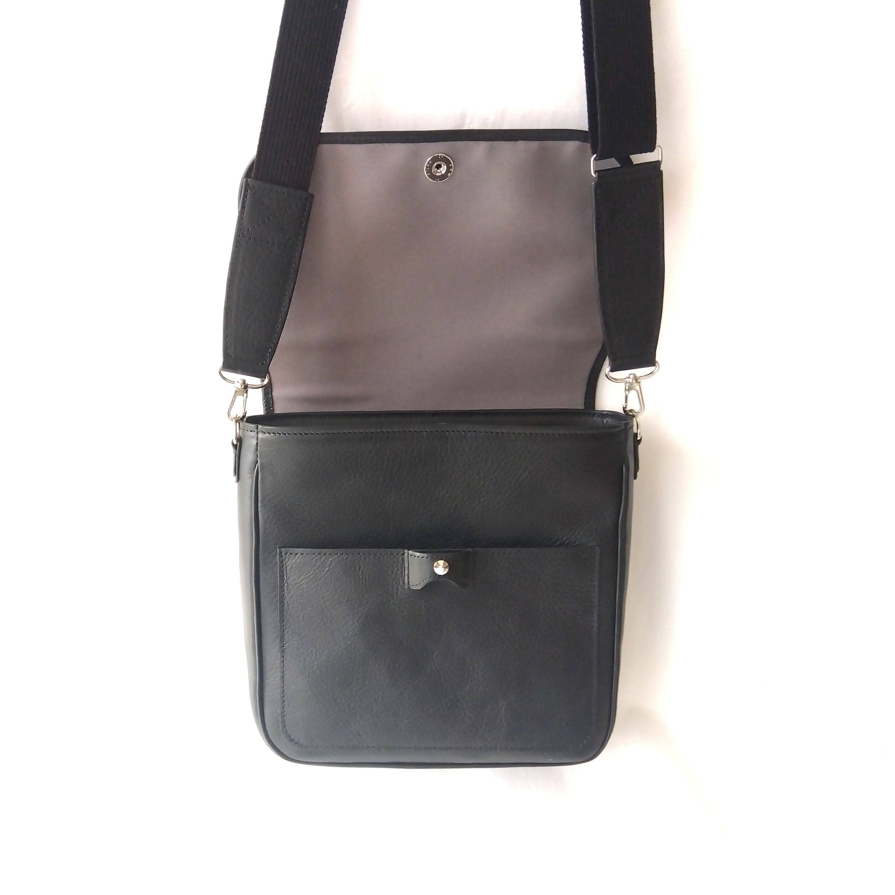 フラップを開けると、書類や手帳も入るゆったりサイズのオープンポケット。スマホや手帳などの収納に便利です。